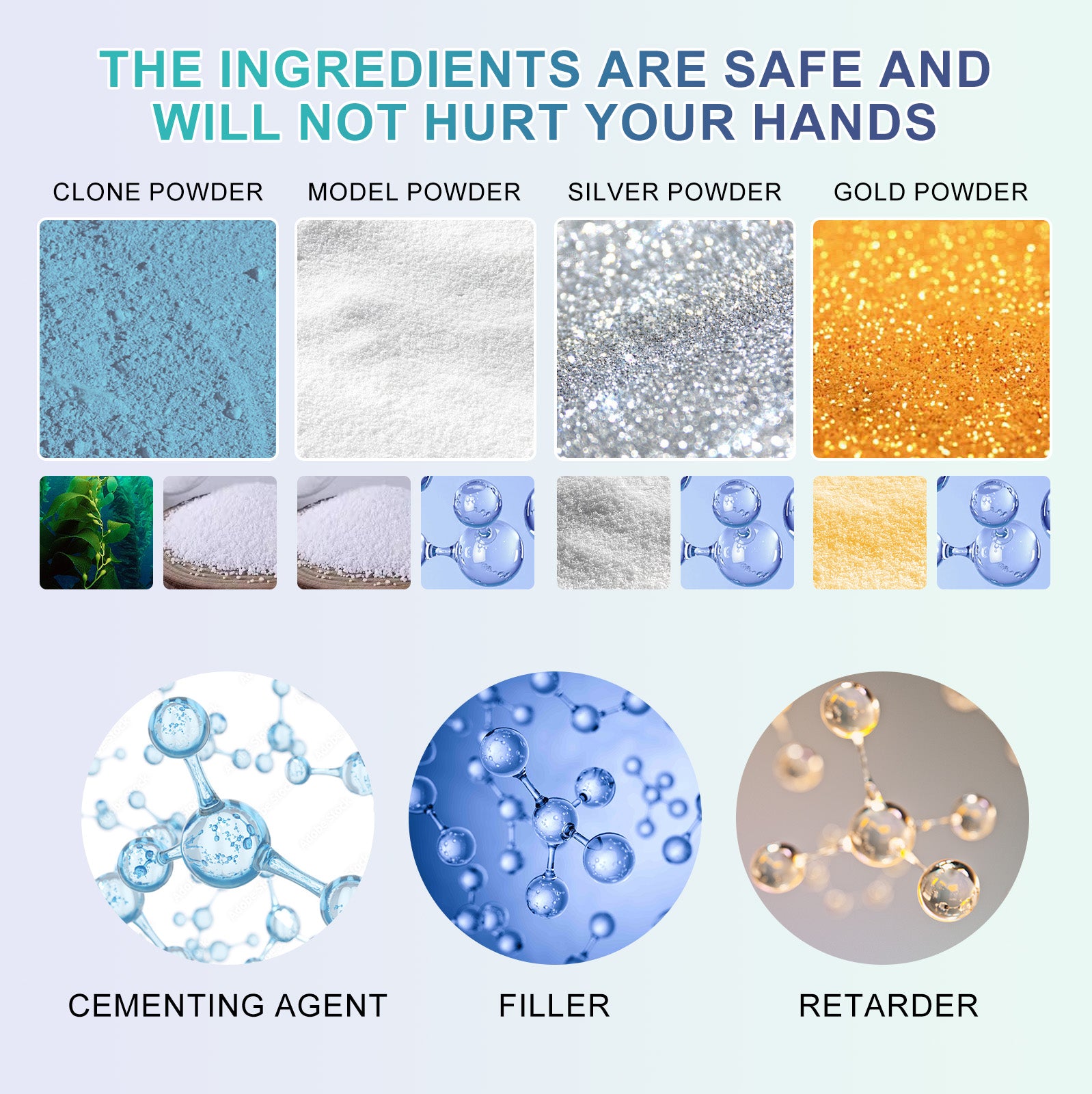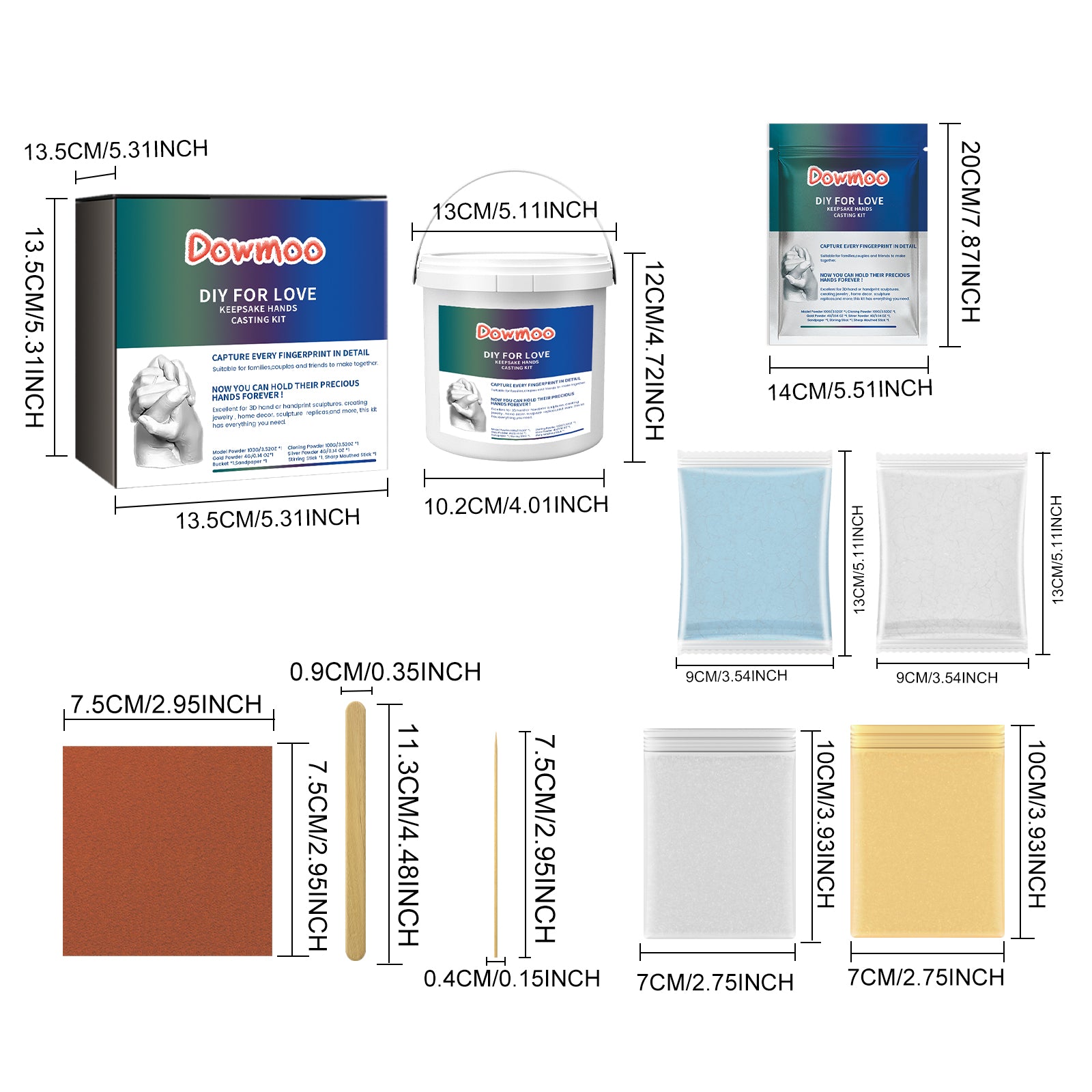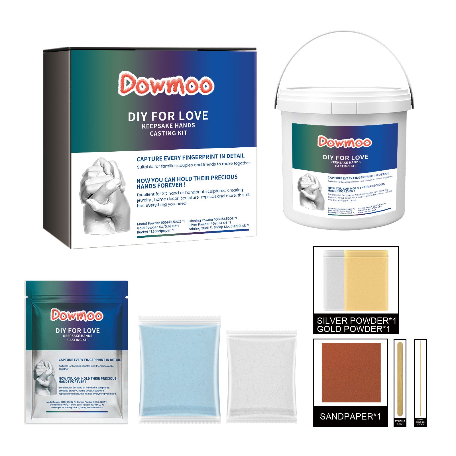 Our couple's DIY Hand Mold includes adhesive, retarder, and filler. It can record the growth process, meticulously capturing every fine line and fingerprint, allowing you to create products that are even more perfect—a testimony of love. Its usage method is very simple: add cloning powder and water into a bucket, stir evenly with a stirring rod, place your hand in the solution and wait for 3-5 minutes for it to change color and solidify, then gently shake your hand to take it out. Then add the styling powder and water to another bucket and mix thoroughly with a stirring stick. Pour the mixture into the mold and gently tap the edges of the bucket to reduce air bubbles. Wait for more than 30 minutes for solidification before peeling off the clone layer. After peeling off, you can use sandpaper for processing and coloring as needed. Suitable for teenagers, adults, couples and friends to create priceless memories together, it's an excellent choice for gifts.