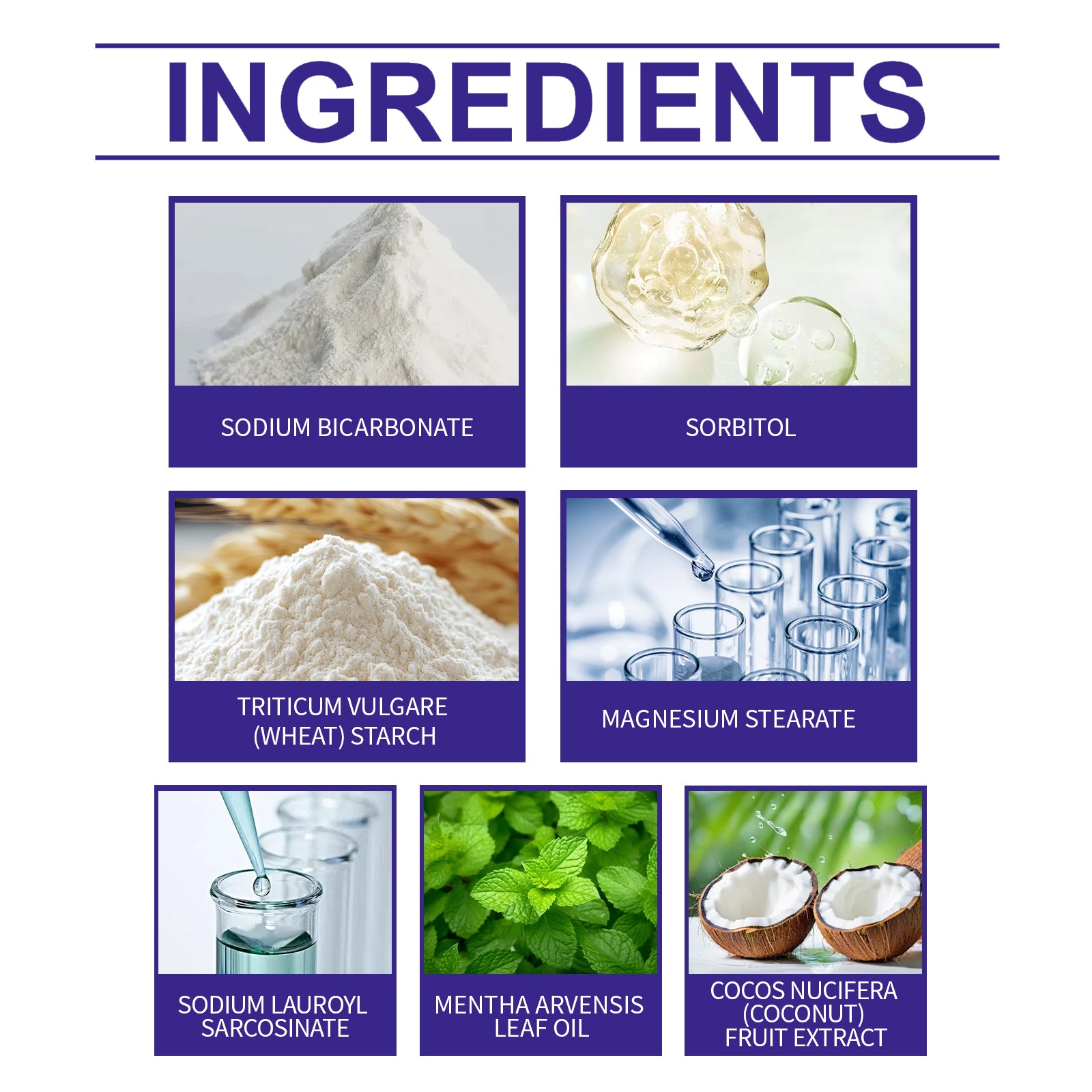 Our teeth cleaning powder contains field mint leaf oil and coconut fruit extract. It can balance the shade of teeth, reduce coffee, alcohol, and tobacco stains, enhance overall brightness, and make teeth whiter. Reduce the corrosion of teeth by foreign objects, reduce tooth decay, strengthen tooth enamel, and enhance oral health. Its usage method is very simple: 1. Wet the toothbrush first and dip it in some tooth powder; 2 Brush your teeth gently for 2-3 minutes according to the correct brushing method;3 After brushing your teeth, rinse your mouth with water. It has a refreshing mint flavor that can freshen breath and reduce bad breath. The scent is long-lasting and makes you smile more confidently. The cleaning ingredients penetrate into the gaps of tooth enamel, reducing embedded food particles and deep stains without leaving any residue, helping to clean teeth.