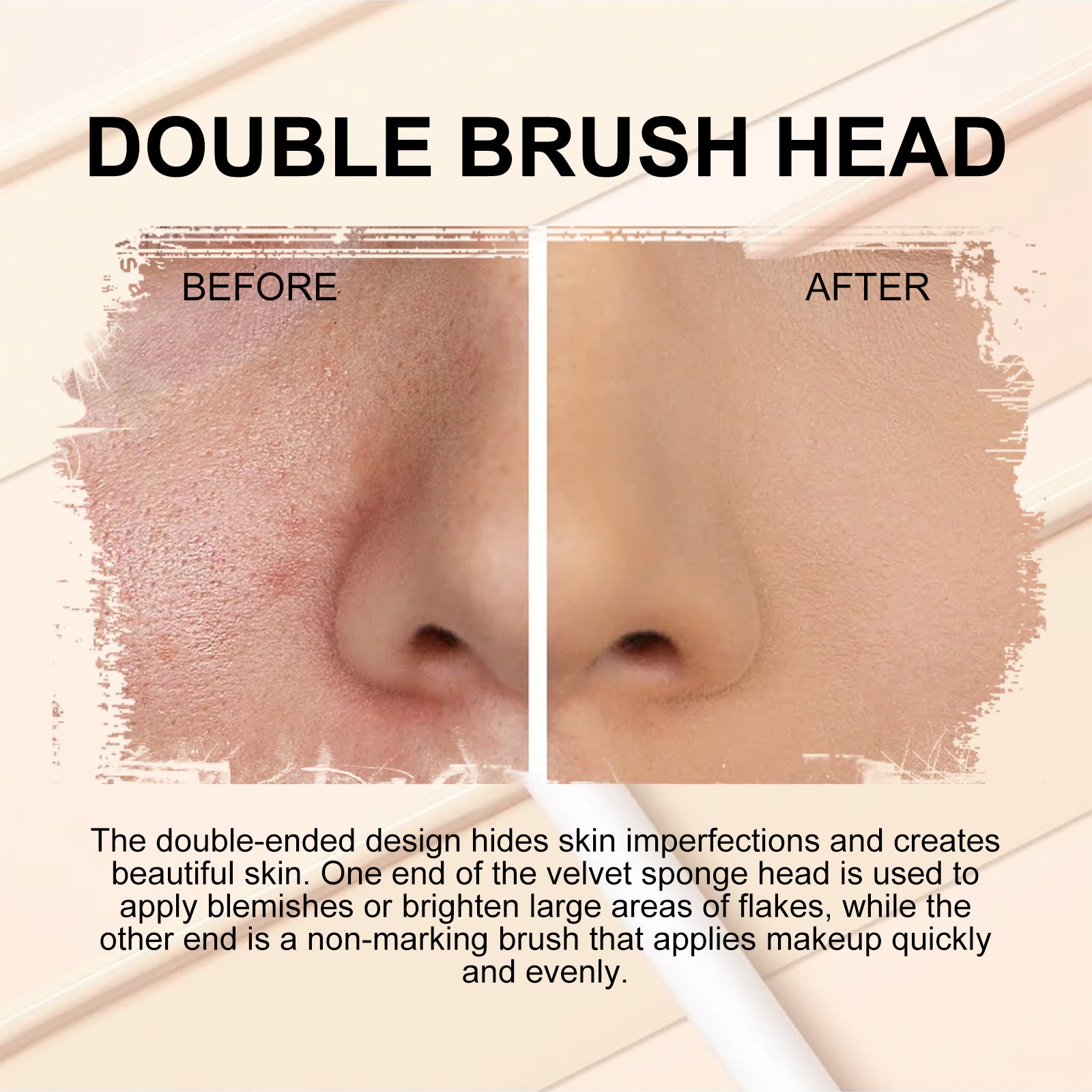 Our double-ended concealer stick contains titanium dioxide, sodium hyaluronate, and vitamin E. It can effectively cover tear troughs and dark circles, hide spots and acne, and easily cover facial blemishes such as lip lines and acne scars. Its usage method is very simple: take an appropriate amount of product and apply it to the areas that need to cover dark circles, acne, and spots. Use a concealer brush to spread the concealer evenly on the face. The dual-head design hides skin imperfections. One end of the velvet sponge head is used for applying blemishes or highlighting large areas of skin, while the other end is a non-transfer brush that allows for quick and even makeup application.