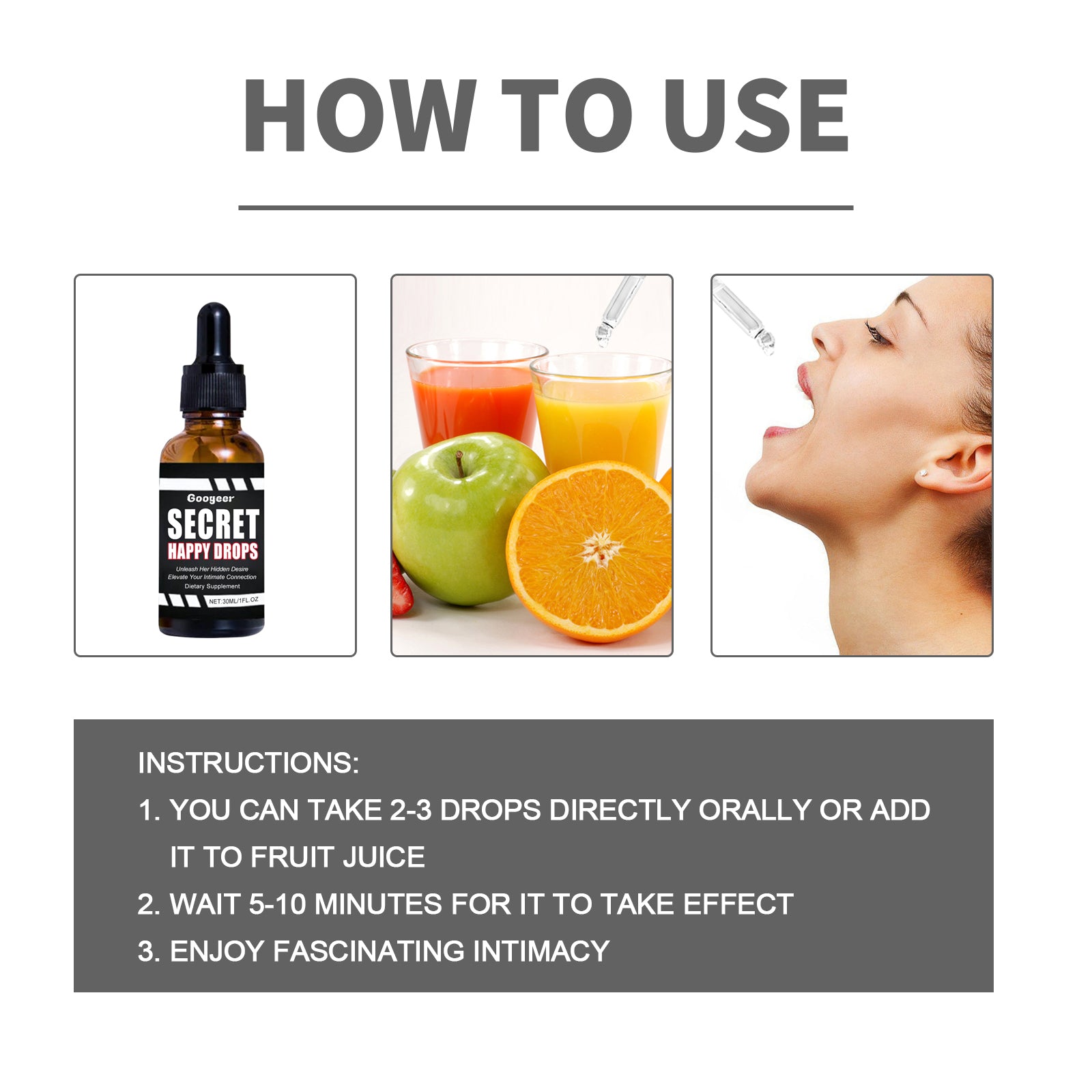 Our Secret Happiness Drops contain Brazilian Melaleuca Extract and Tribulus Terrestris Extract. It can enhance intimacy between partners, contribute to overall health and balance in the body to help increase excitement. Its usage method is very simple: 1. You can take 2-3 drops directly orally or add it to juice. 2. Wait 5-10 minutes for it to take effect. 3. Enjoy charming intimacy. It can also increase physical energy and enhance the experience of intimacy, making both parties more satisfied.