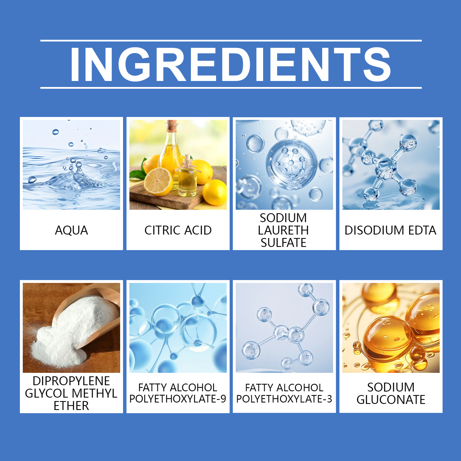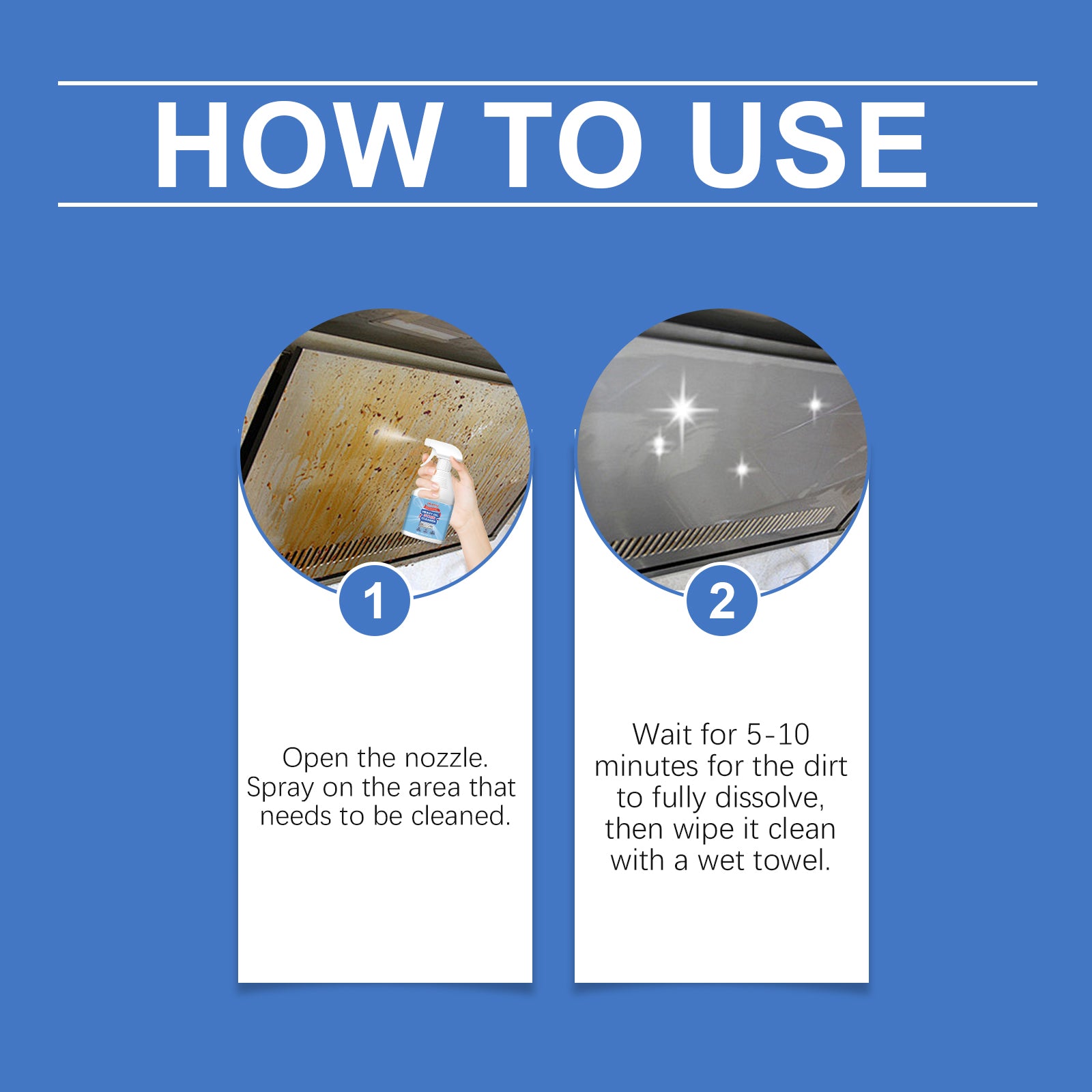 Our heavy oil stain cleaner contains sodium gluconate, citric acid, and disodium EDTA. It can effectively remove grease and quickly dissolve kitchen grease stains, making your kitchen look brand new. It's easy to use: open the nozzle. Spray on areas that need cleaning. Wait for 5-10 minutes until the dirt is completely dissolved; then wipe clean with a wet towel. And it can be used with care to reduce skin irritation.