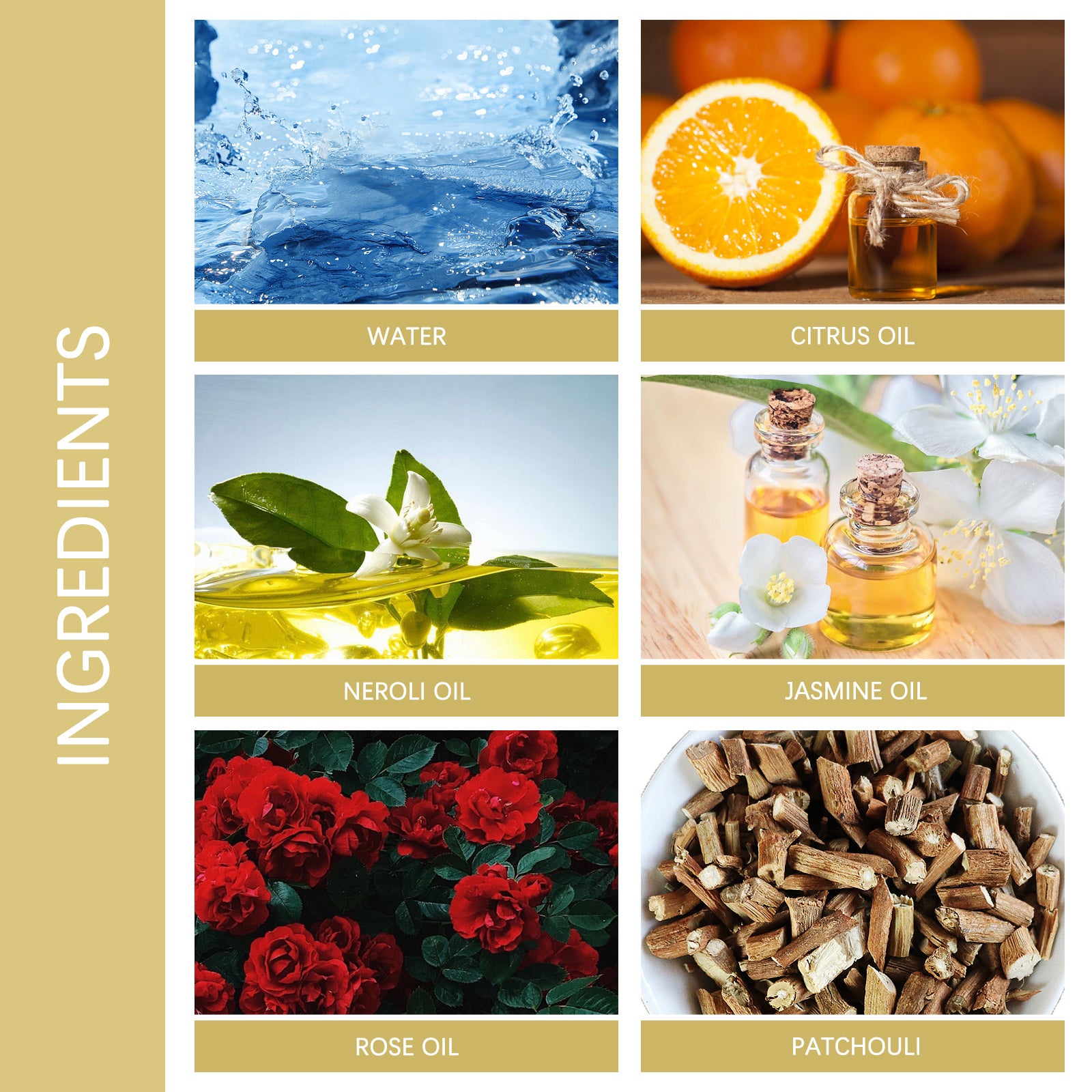 Our women's eau de toilette contains citrus oil, neroli oil, and jasmine oil. It can make people smell fresh and fragrant, enhance feminine charm, and enhance intimacy with partners. Its usage method is very simple: apply an appropriate amount evenly on wrists, behind ears, neck, and other desired areas for fragrance retention, and it naturally emits an enchanting scent. The fragrance lasts long and has a special scent that makes one the center of attention wherever they go.