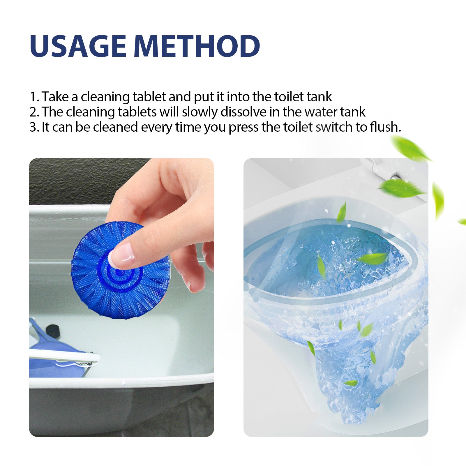 Our toilet cleaning tablets contain sodium dodecylbenzole sulfonate, disodium EDTA, and aluminum powder. It can clean the toilet, making the water clearer and cleaner. It effectively cleans stubborn stains on toilets, water tanks, and pipes, allowing you to enjoy a clean and fresh toilet. Its usage method is very simple: take a cleaning tablet, place it in the toilet tank, and the cleaning agent will slowly dissolve in the tank. Each time you flush the toilet, it will clean. And it can clean the toilet.