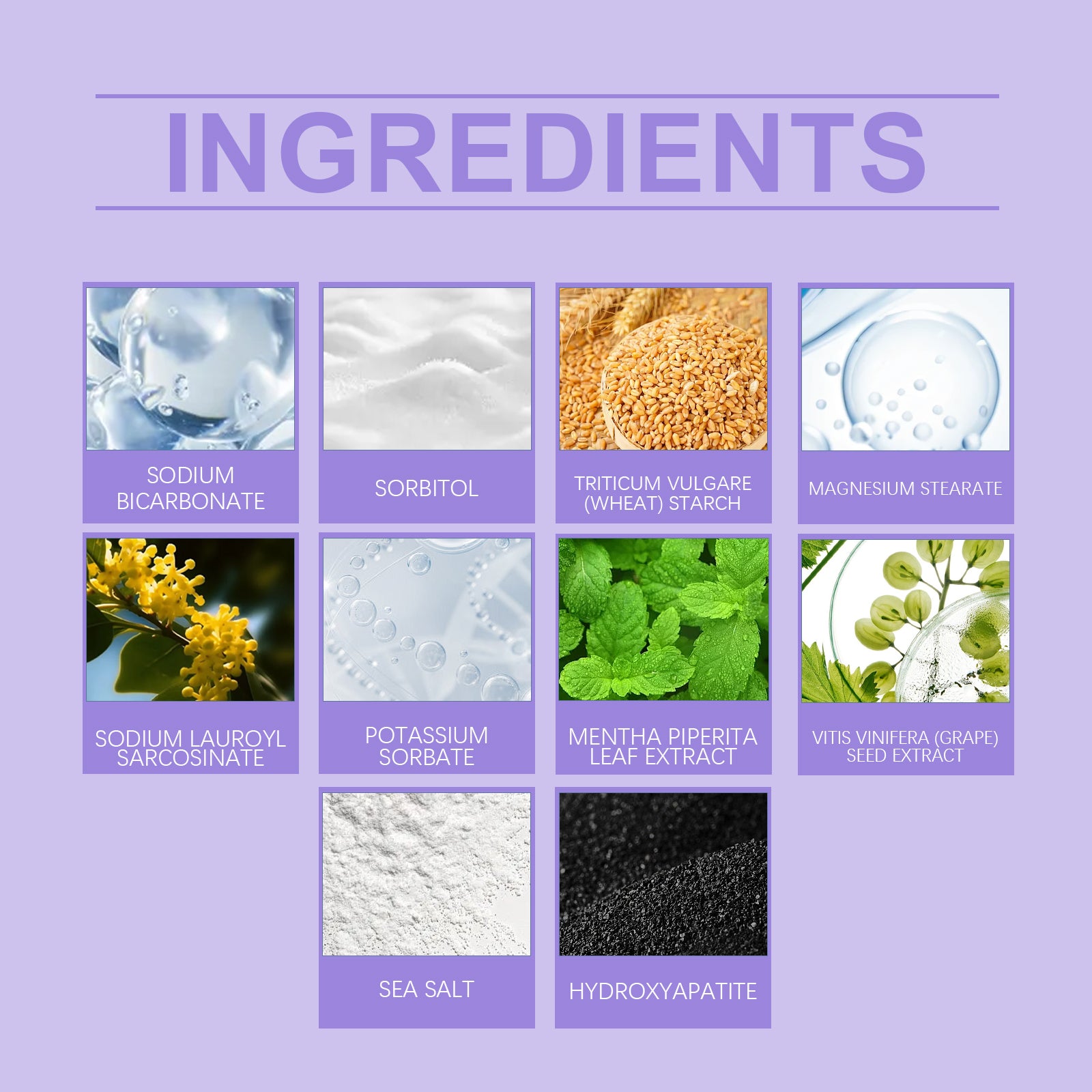 Our purple whitening tooth powder contains sodium bicarbonate and sorbitol. It can gently clean the tooth surface and help restore its shine. Effectively reduce gum discomfort and support gum health. Its usage method is very simple: wet your toothbrush and then dip it into an appropriate amount of this product. Brush your teeth properly for 3 minutes and rinse your mouth with water until it's clean. It can also eliminate oral odor and maintain fresh breath for a long time.