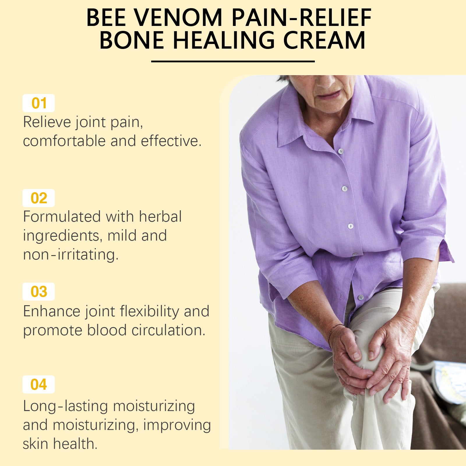 Our Bee Venom Joint Repair Cream contains mineral oil, glycerin, and glycerol stearate. It can effectively relieve joint pain and discomfort, providing instant comfort. Helps reduce joint stiffness and improve mobility. Its usage method is very simple: apply an appropriate amount of this product to the painful joints and bones, gently massage for better absorption. And it has strong anti-inflammatory and lubricating effects.