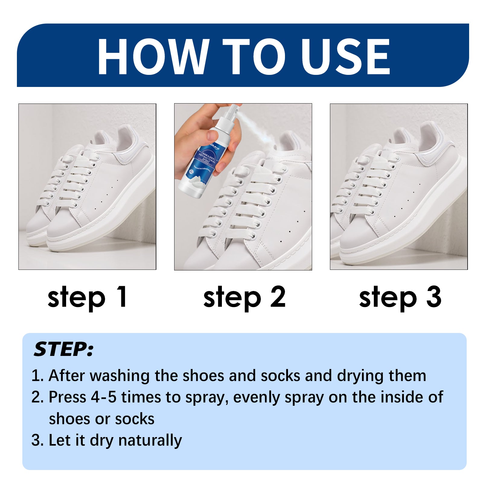 Our shoe and sock deodorizing spray contains silver oxide and fragrance. It can quickly destroy odor molecules, eliminate fungi, effectively resist various bacteria and fungi, remove shoe odor, and leave a fresh fragrance. Its usage method is very simple: after washing and drying the shoes and socks, press the spray 4-5 times, evenly spray on the inside of the shoes and socks, then let them air dry naturally. Effectively resist bacteria and fungi, prevent fungal growth, and eliminate odors.